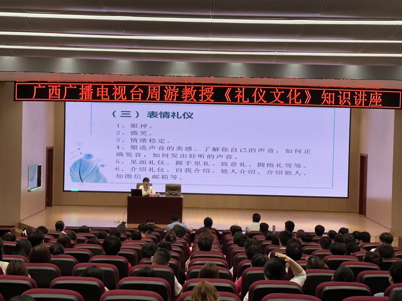 为了进一步加强师生礼仪文化教育,4月3日上午,广西广播电视台播音指导、广西大学硕士研究生导师周游教授应邀在空港校区8408报告厅为南宁分校师生作《礼仪文化》知识讲座。南宁分校副校长陈东莲出席讲座,南宁分校党政办公室、财务工作部全体人员,各职能部门、系部师生代表,分校礼仪队,学生社团代表近300人现场聆听讲座。